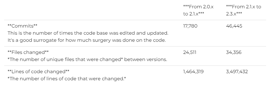 The chart below shows a comparison of the Magento code base when comparing 2.0 to 2.1 versus when comparing 2.1 to 2.3. We’ll probably do an update of the research for 2.1 to 2.2 and 2.2 to 2.3, but, the scope of this analysis was for projects moving from 2.1 to 2.3.